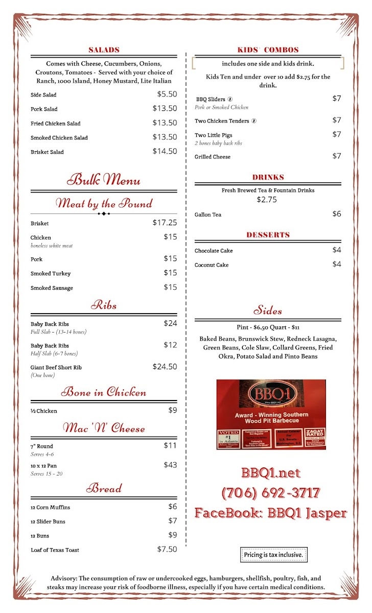 Welcome to BBQ1 JASPER, a standout barbecue destination nestled in Jasper, GA. Here, flavorful barbecue takes center stage, with a menu that promises to tantalize your taste buds.